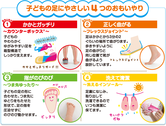 2本のマジックバンドで、甲や足首もしっかりとめることがきるので、歩きに不安のあるお子さんや成長期のお子さんへおすすめの商品です。