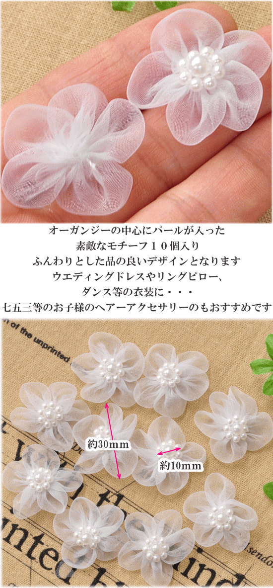 )パールの付いたオーガンジーフラワーモチーフ10個入りふんわりとした純白の小花のモチーフはウエディングアイテムにぴったりリングピローやドレス、ベールなどにいかがですか。